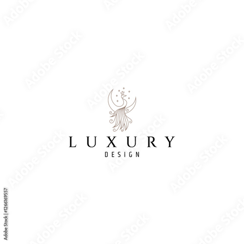 peacock logo with combination of crescent moon decorated with stars in line art design style