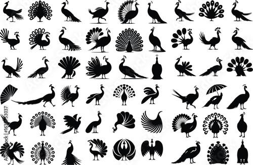 Peacock Silhouette with Spread Feathers – Majestic Bird Icon Elegant Peacock Icon – Open Feather Display Silhouette Set