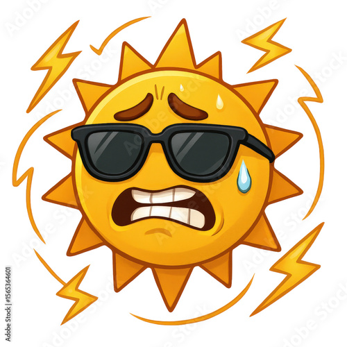 peak energy demand concept. Frowning sun wearing sunglasses with sweat and lightning bolts.