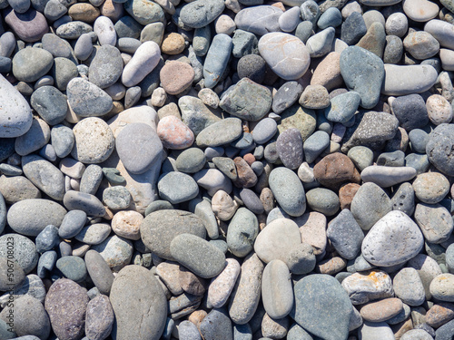 Pebbles on the beach. Background from stones. Cobblestones on the beach.