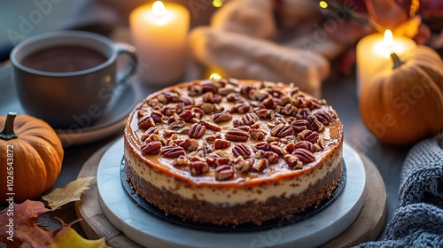Pecan cheesecake on a table with candles, pumpkins, and a cup of coffee, creating a cozy autumn atmosphere