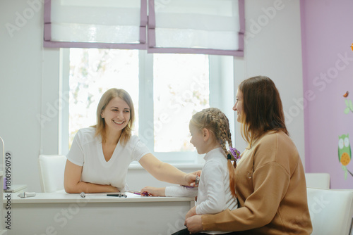 Pediatrician examining young girl with a stethoscope, child smiling