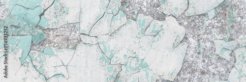 Peeling paint on the wall. Old concrete wall with cracked flaking paint. Weathered rough painted surface with patterns of cracks and peeling. High resolution texture for background and design. Closeup