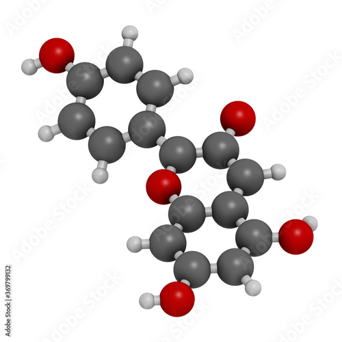 Pelargonidin pigment molecule. 3D rendering. Atoms are represented as spheres with conventional color coding: hydrogen (white), carbon (grey), oxygen (red).
