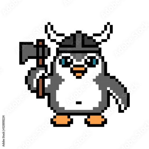 Penguin viking in horned helmet holding an axe, pixel art animal character isolated on white background. Old school retro 80s, 90s 8 bit slot machine, computer, video game graphics. Cartoon mascot.