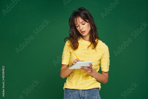 Pensive young girl writing startup business ideas, plans, creative thoughts to notebook, make to-do list not to forget
