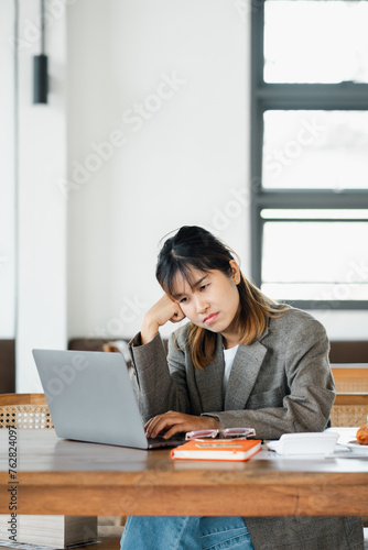 Pensive young woman in a blazer focuses on her laptop in a modern, well-lit room.