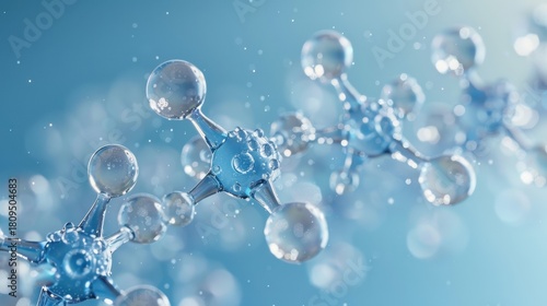 Pentagonal Molecule Light Blue Background gel spheres representing skincare ingredients like coenzyme Q10 and hyaluronic acid, with a clean, abstract background for dermatology and beauty applications