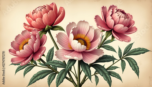 Peony flowers in vintage style on textured background, Peony Flower, Mid-Autumn Festival