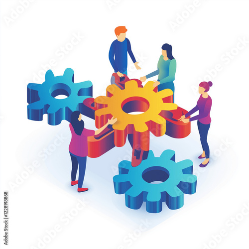 People assembling colorful gears in a digital workspace