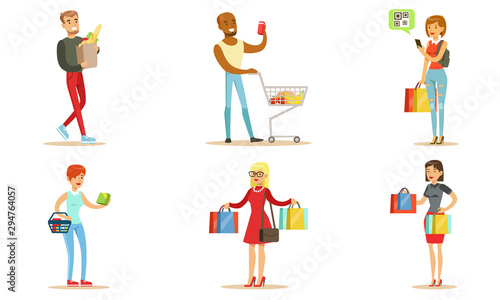 People Carrying Shopping Bags with Purchases Set, Young Men and Women Buying Groceries and Taking Part in Seasonal Sale at Store Vector Illustration