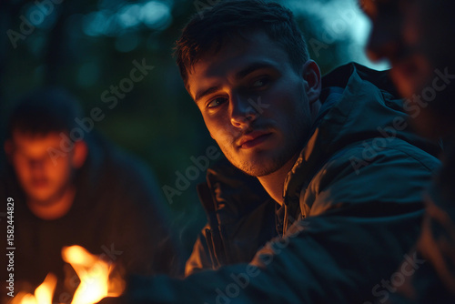 People friends family sitting by campfire in forest in peaceful outdoor wilderness scene, generative ai