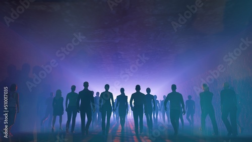 People go to light in the fog. In long tunnel. The crowd is moving into the distance. Throng goes in one direction. Mysterious world. Way to paradise. 3D rendering