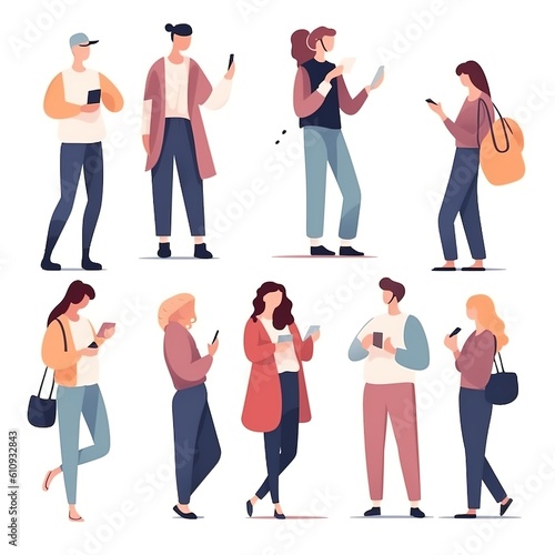 People holding, using mobile phones set. Characters with smartphones in hands. Men, women use cellphones, surfing internet, chatting. Flat graphic vector illustrations