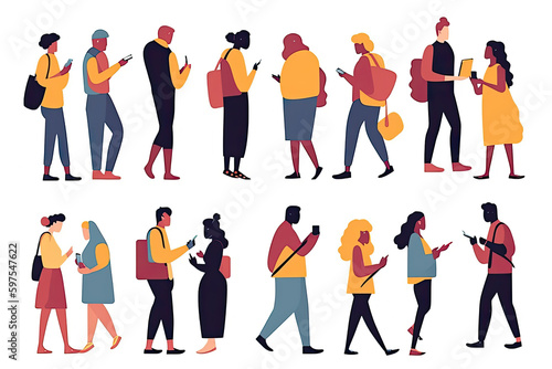 People holding, using mobile phones set. Characters with smartphones in hands. Men, women use cellphones, surfing internet, chatting. Flat graphic vector illustrations. Ai generative