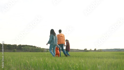 people in the park. happy family a walk at sunset. mom dad and daughter walk holding hands in the park. happy family kid dream concept. parents and fun baby walking life forest park
