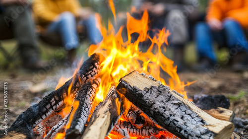 People share stories around a warm campfire in a forest clearing during a cool evening