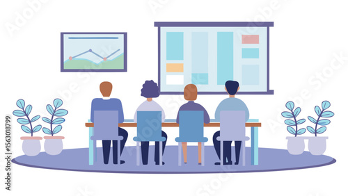 People sitting at a conference table looking at a presentation screen with data charts displayed