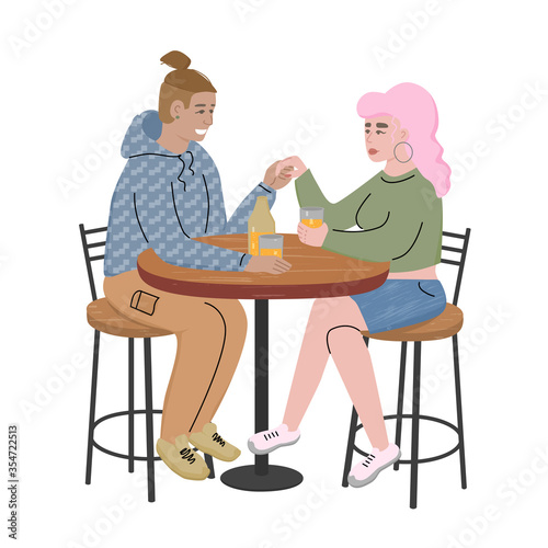 People sitting at the table in a bar and drinking beer and wine. Woman and man talking and smiling in a cafe. Boy and girl dating in a restaurant. Cartoon flat characters isolated on white.Vector