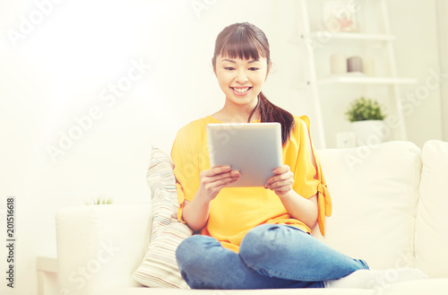 people, technology and leisure concept - happy young asian woman sitting on sofa with tablet pc computer at home