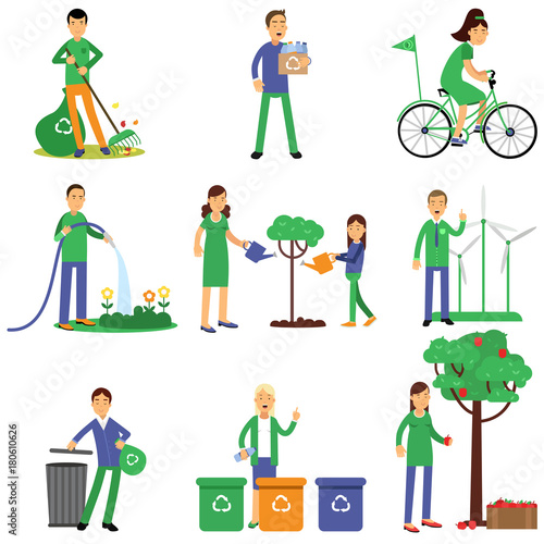People volunteers cartoon characters contributing into environment preservation, flat style