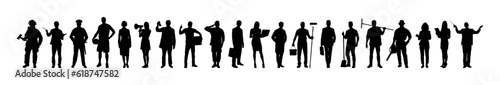 People with various professions standing together in row vector black silhouettes set collection.