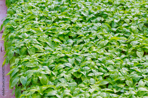 Pepper seedlings grow in a greenhouse. Beautiful green leaves.