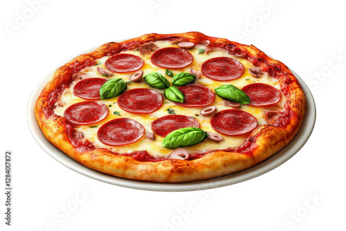Pepperoni Pizza with Basil and Olives on Plate, Delicious Fast Food Cuisine.