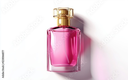 Perfume bottle with a golden sprayer and a pink translucent body isolated on a white background