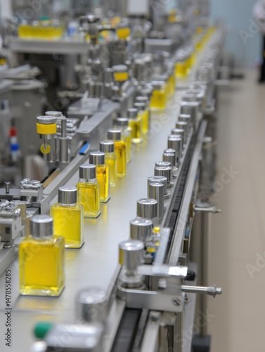 Perfume bottles on conveyor belt in factory for automated manufacturing process close up industrial production line