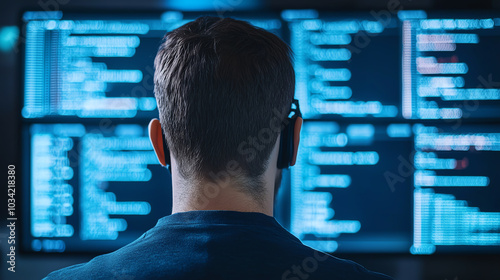 Person analyzing data on multiple screens.