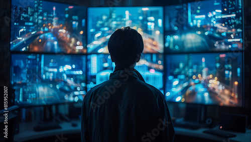 Person Analyzing Multiple Cityscape Screens in Dark Room, Technology and Surveillance Concept, Cybersecurity, Data Analysis, Urban Traffic Monitoring, Digital Interface, Nighttime, High-Tech Setup