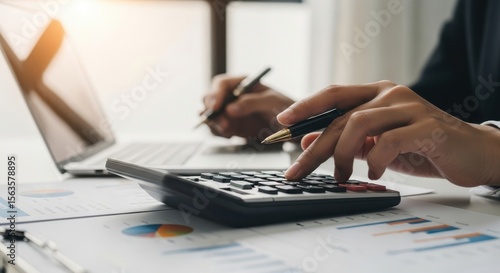 Person calculating data on a calculator while holding a pen, with laptop and charts in the background.