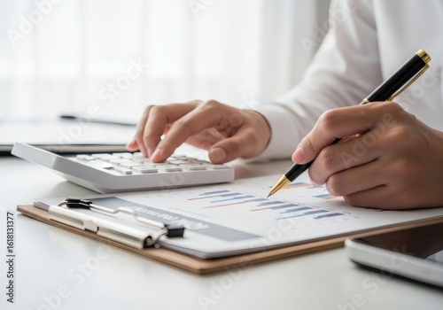Person calculating on a calculator with a pen on a chart