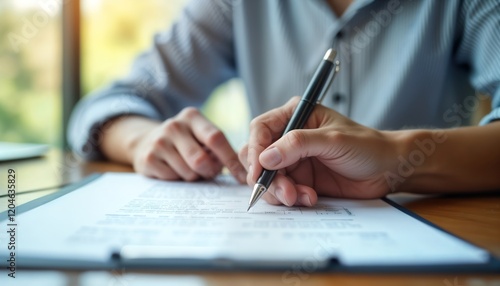 Person fills out paperwork with pen. Formal document completion. Application form. Official process. Bureaucracy. Hand holds pen. Person signs document at desk. Focus on hands, paperwork. Possible