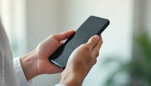 Person holding a smartphone with a blank screen