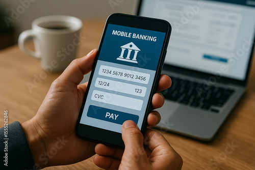 Person holding a smartphone with mobile banking app open near a laptop and coffee mug on table