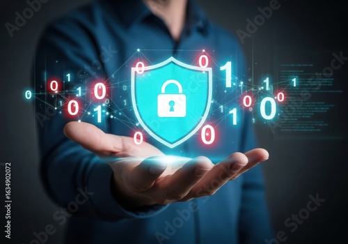 Person holding digital shield with binary code and padlock icon hand security