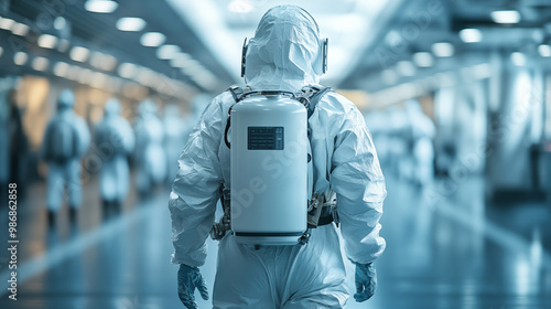 Person in protective suit disinfecting hospital hallway during pandemic
