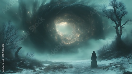 Person in robe gazing at a swirling, glowing vortex in a dark, snowy landscape.