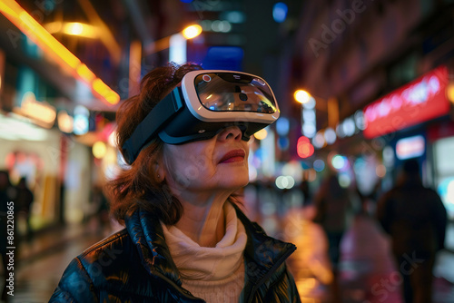 Person in vr virtual reality goggles visiting metaverse gaming world tech addicted, Generative AI