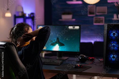 Person preparing to play video games on monitor. Woman using keyboard and mousepad, playing online game on computer at desk. Player gaming in cyberspace, having fun with games.