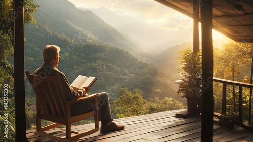 Person reading book with mountain view.