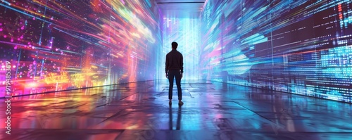Person standing in futuristic digital space with vibrant neon lights and virtual reality elements, symbolizing technology and innovation.