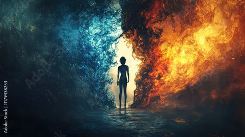 Person stands at the junction of fire and ice in a surreal landscape at twilight. Generative AI
