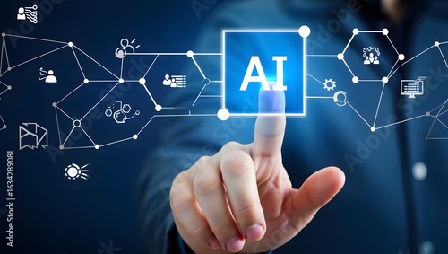 Person touching a glowing blue screen displaying the letters ai with a network of icons