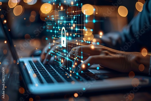 Person typing laptop glowing padlock keyboard