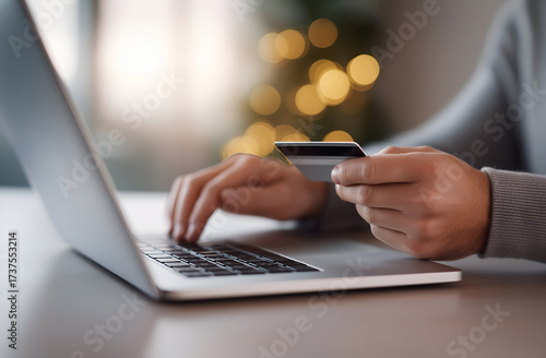 Person typing on a laptop and holding a credit card, engaging in online shopping and securely making payments for e commerce transactions from home, illuminated by festive bokeh