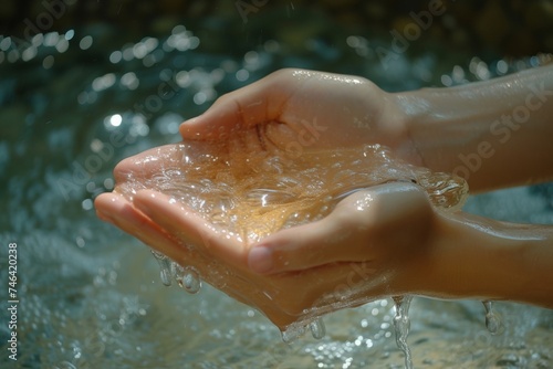 Person washing hands with water in bathtub, water flowing out of hands Hygiene and cleanliness concept in home bathroom