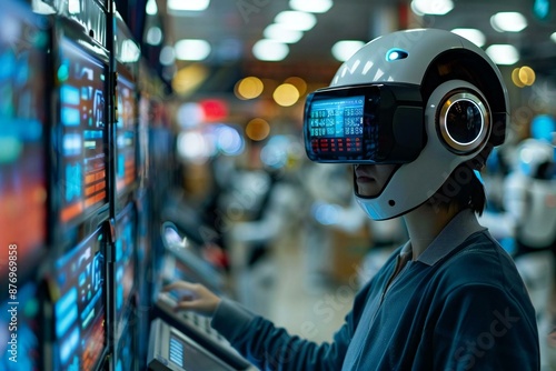 Person wearing augmented reality glasses using holographic screens to calculate invoices with the help of AI robots in a futuristic office setting.